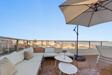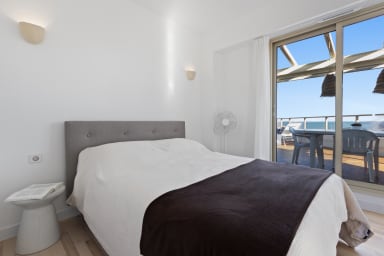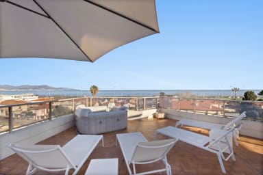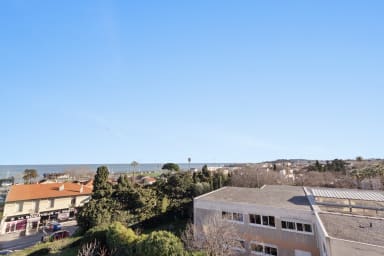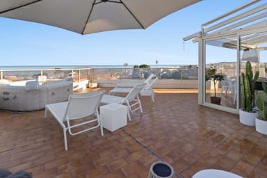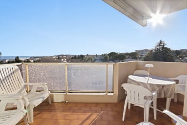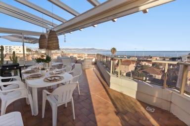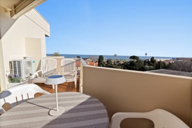 * Spacious and bright. * Sea + Jacuzzi (May to October). * Comfort: 2 bedrooms with 3 double beds and 2 shower rooms. * Private terraces: Ideal for relaxing outdoors with sea views. * Private parking. * Shops, restaurants and transport. * A/C in one bedroom and the living room. * Motorway and Old Antibes accessible in a few minutes by car.