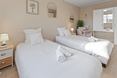 Baigné de lumière naturelle, le logement offre deux belles chambres. Une avec lit double 160 et une avec 2 lits simples, une salle de bains moderne et un séjour convivial ouvert sur de superbes terrasses privées — idéales pour vos petits-déjeuners au soleil ou vos apéros face à la mer.